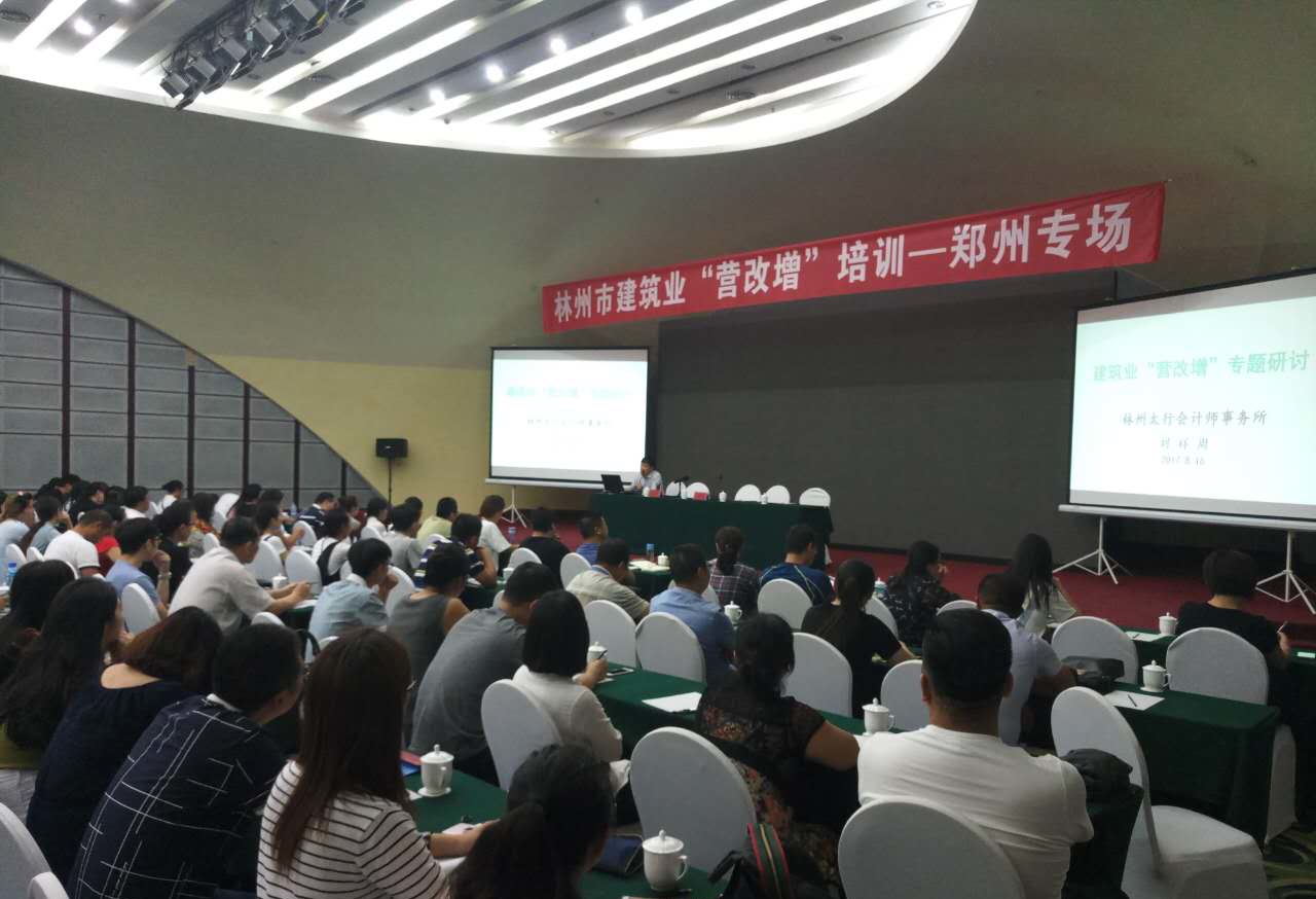 2017年8月20日,林州市建筑业“营改增”专题培训郑州光华大酒店专场培训班开讲。“营改增”专题培训从建筑业“营改增”的应对、建筑业“营改增”后建章立制、建筑业“营改增”后项目部抵扣要点以及建筑业“营改增”后项目部管理要点等方面进行培训。